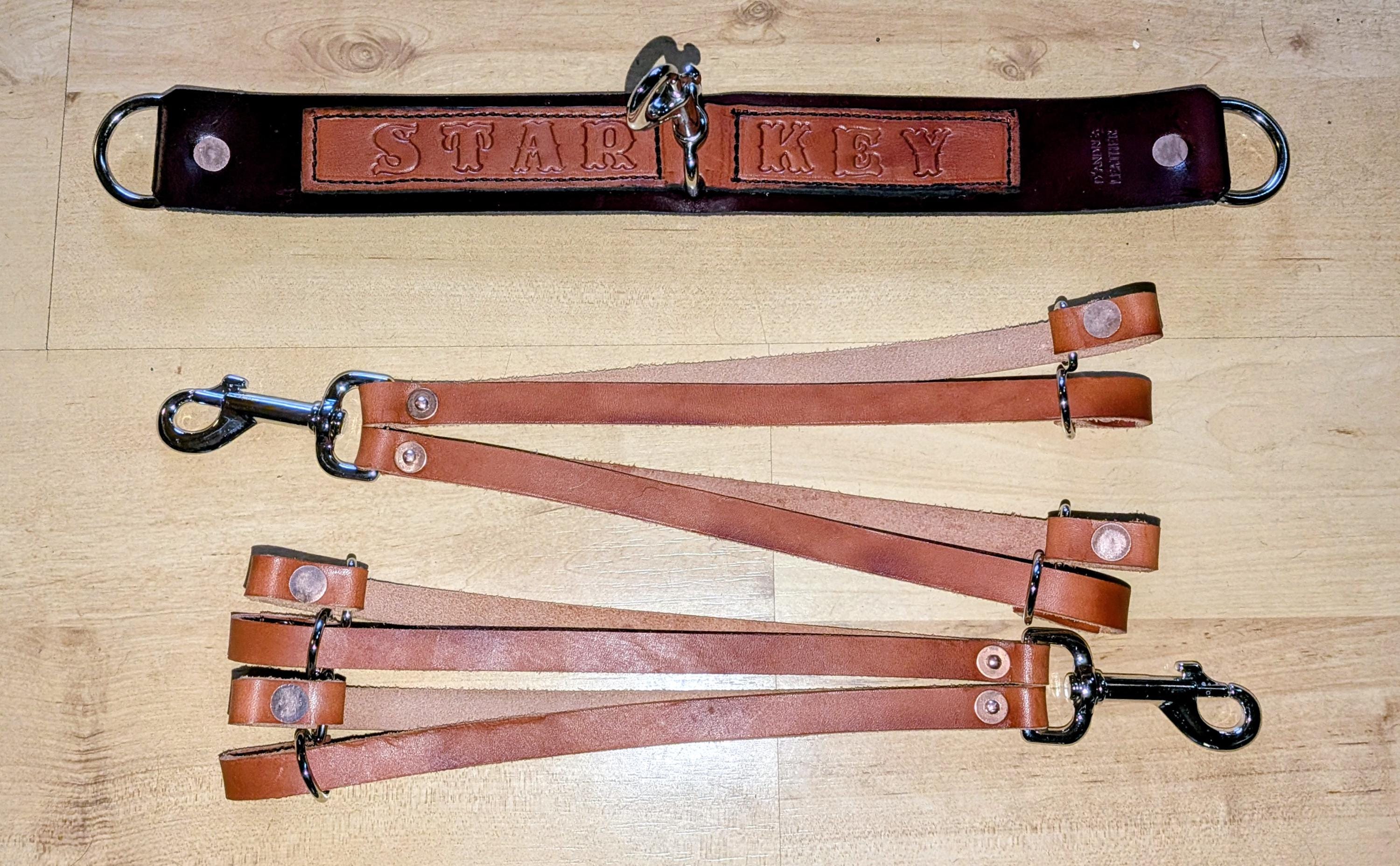 I cut the pattern and leather straps. Then personalize with a name; dye and dry it. I cut, 'semi' oil and fit your hunting straps with copper rivets and quality hardware. I then Antique and oil over your chosen name.